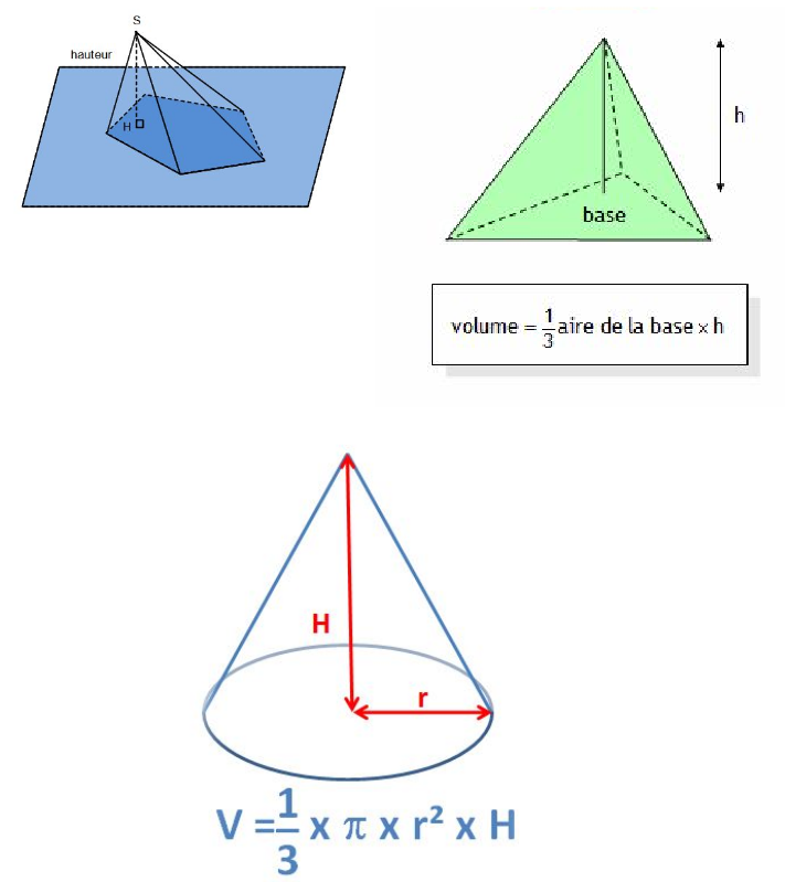 Une même formule permet de calculer le volume d’une pyramide ou d’un cône.
