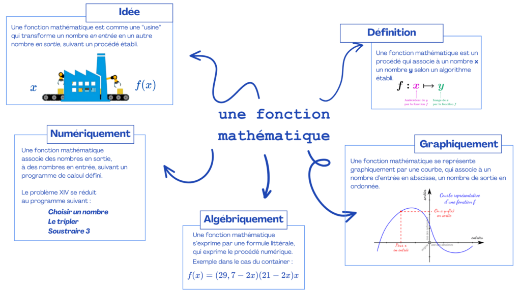 On appelle fonction une application qui, à tout élément x de l’ensemble A, fait correspondre un élément et un seul, noté f(x), de l’ensemble B.
