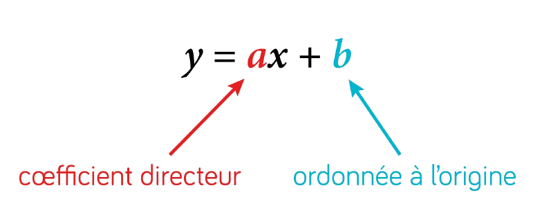 - Une fonction affine s’écrit sous la forme , étant le coefficient directeur, et l’ordonnée à l’origine.