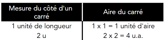 - La 3ème construction illustre que quand la longueur double, l’aire quadruple.