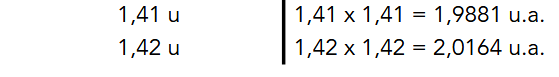 Nous cherchons la mesure d’un carré dont l’aire vaut 2 unités d’aire. Il faut donc chercher une mesure entre 1 et 2 unité de longueur (plus proche de 1 que de 2).