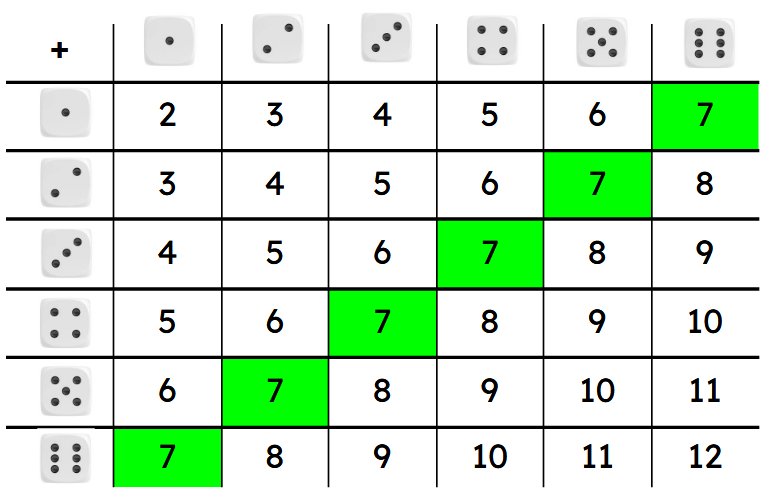 P(7)= 6/36 = 1/6 ≈ 0,17 = 17%